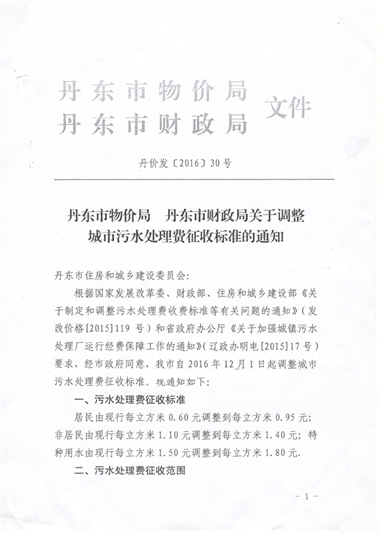 • 丹東市物價(jià)局 丹東市財(cái)政局關(guān)于調(diào)整城市污水處理費(fèi)征收標(biāo)準(zhǔn)的通知2017-06-15