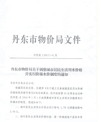 • 丹東市物價(jià)局關(guān)于調(diào)整城市居民生活用水價(jià)格并實(shí)行階梯水價(jià)制度的通知2017-06-15
