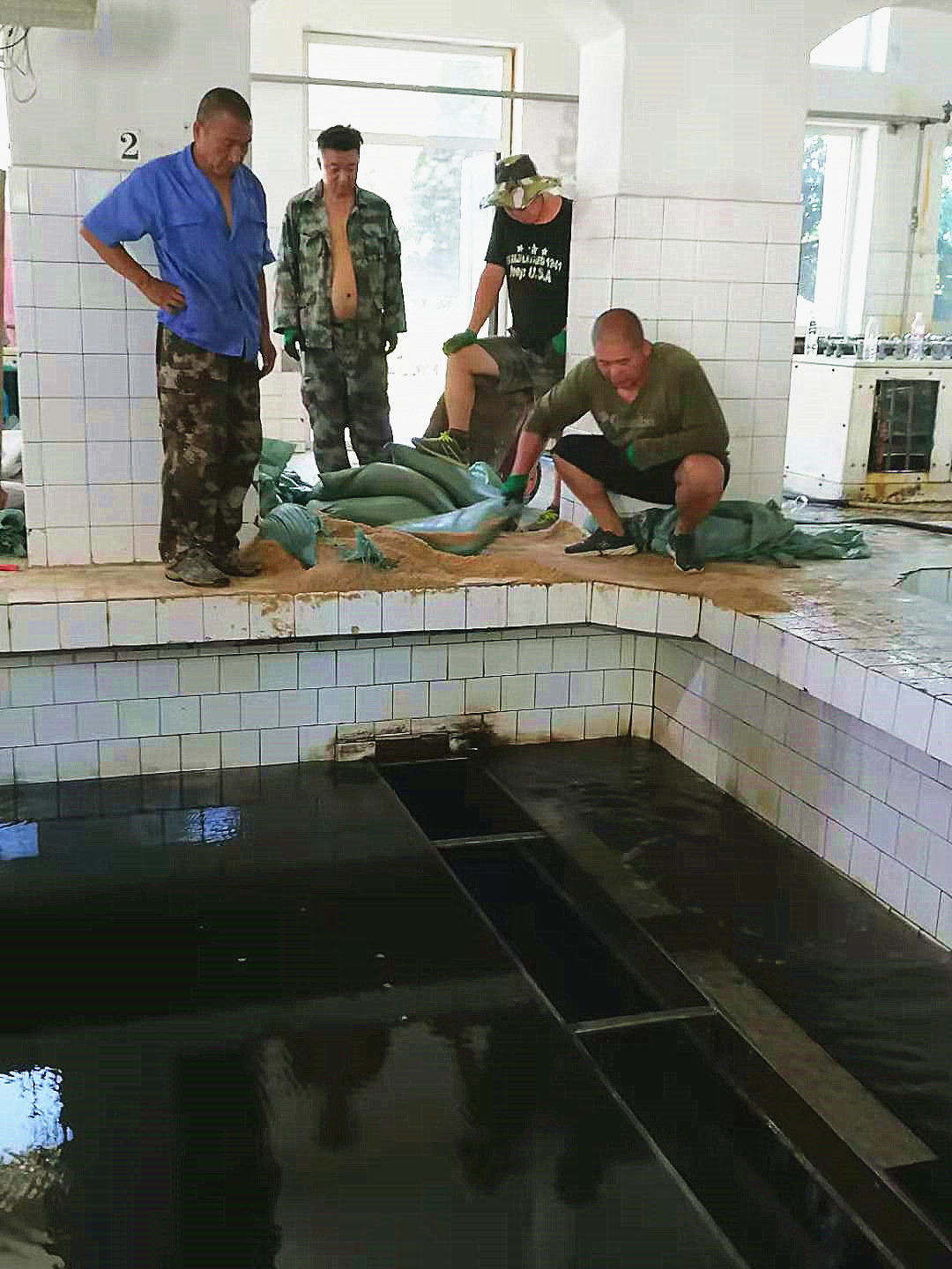 四道溝水源為保證水質,汛期前對反應池沉淀池進行清淤工作,對一級泵站設備進行維護保養大修。由于四道溝水源江心井吸水籠頭損壞,不能有效攔截江中雜物,致使一級泵站取水水泵經常堵塞,值班員和維修人員只能打開泵蓋進行人工清掏,最多時每天清掏3次。由于四道溝、SW新運轉泵站運轉車間內機組運行散發熱量,致使車間內溫度高于室外,最高時達到40度,值班員只能強忍高溫,對設備進行操作和維修。維修班更是頂著炎炎烈日完成日常維修,更換接梨樹泵站4號機組DN150出水水門、更換損壞的接觸器、檢修四道溝水源一泵站3號機組DN300出水水門。